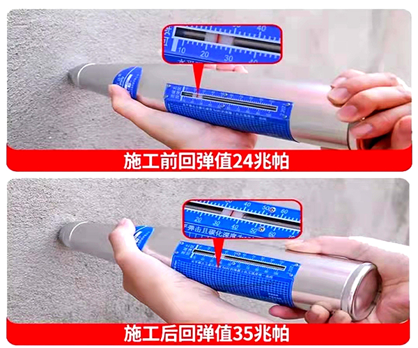 1、緊縮混凝土毛孔,降低混凝土碳化深度。2、提高新舊混凝土回彈強度10-15兆帕。